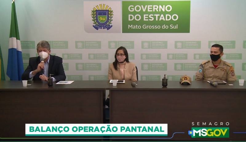 As chuvas dos últimos dias ajudaram no controle dos incêndios no Pantanal. Entretanto, como as previsões são de elevação da temperatura e nova estiagem, as equipes de bombeiros e brigadistas continuarão mobilizadas, observou o secretário de Meio Ambiente, Desenvolvimento Econômico, Produção e Agricultura Familiar (Semagro), Jaime Verruck, durante apresentação do balanço da Operação Pantanal, na manhã desta sexta-feira (21), no auditório da Governadoria. Também participaram o contra-almirante Sérgio Gago Guida, comandante do 6º Distrito Naval, diretamente de Ladário; o coronel Moreira, do Corpo de Bombeiros, e a coordenadora do CEMTEC/MS (Centro de Monitoramento do Tempo e do Clima), órgão vinculado à Semagro, Franciane Rodrigues.