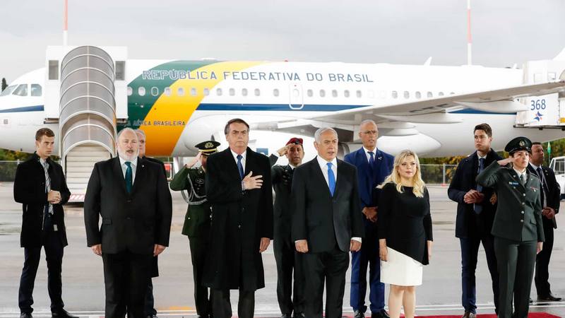 "Eu amo Israel", disse Bolsonaro, em hebraico, ao lado do primeiro-ministro de Israel, Binyamin Netanyahu -que raramente se desloca para o aeroporto para se encontrar com chefes de Estado.