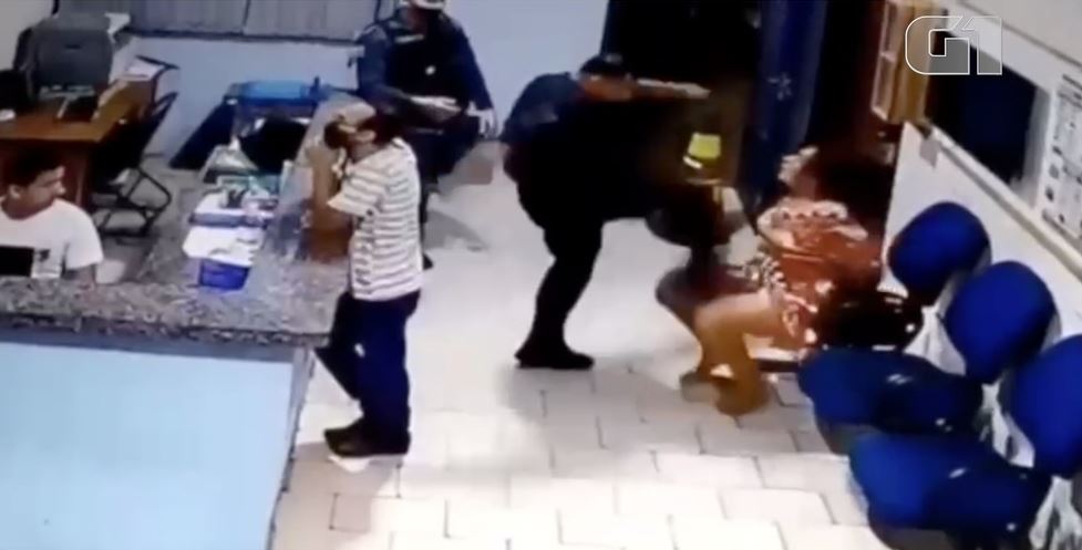 "Eu fiquei desesperada quando soube que iria ficar sem meus filhos e aí o policial me deixou naquela sala, sem poder ligar para ninguém", afirmou. Nas imagens filmadas por uma câmera de segurança, é possível ver o homem agredindo a mulher com socos, tapas e chutes. Ele só é parado quando outra policial militar consegue o afastar de perto da vítima, que tenta se defender.