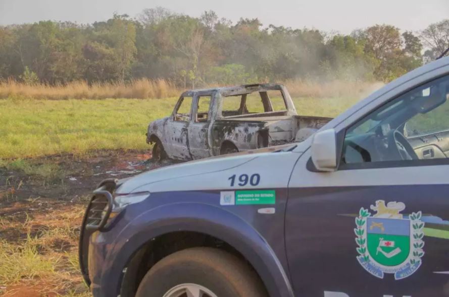 | Viatura da Polícia Militar no local onde a vítima foi encontrada morta com parte do corpo carbonizado ©Silas Lima/Arquivo |