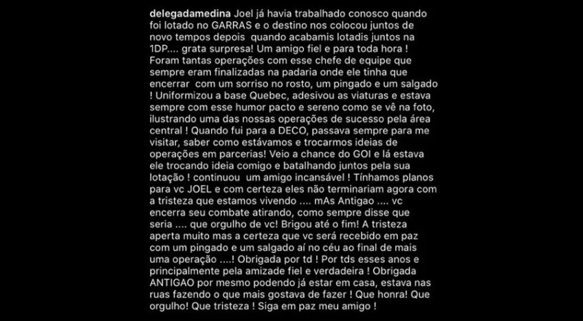 Nas redes sociais, amigos prestaram as homenagens ao policial, “um amigo fiel e para toda hora, foram tantas operações, com este chefe de equipe que eram sempre finalizadas na padaria onde ele tinha de encerrar com um sorriso no rosto!”, diz uma publicação feita pela delegada Medina.