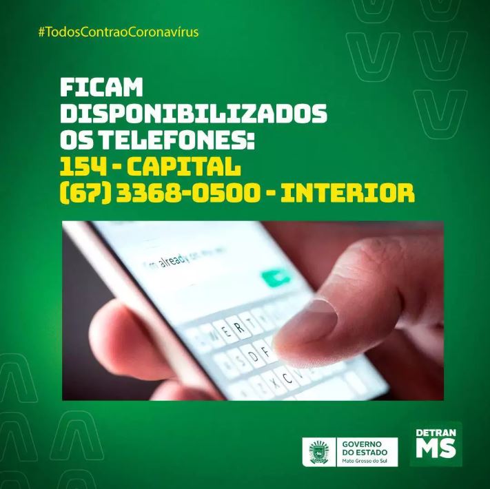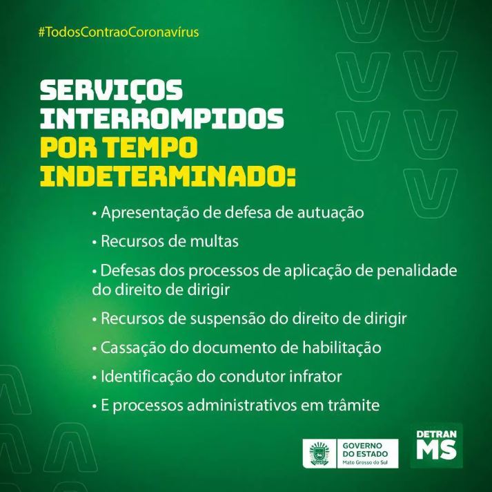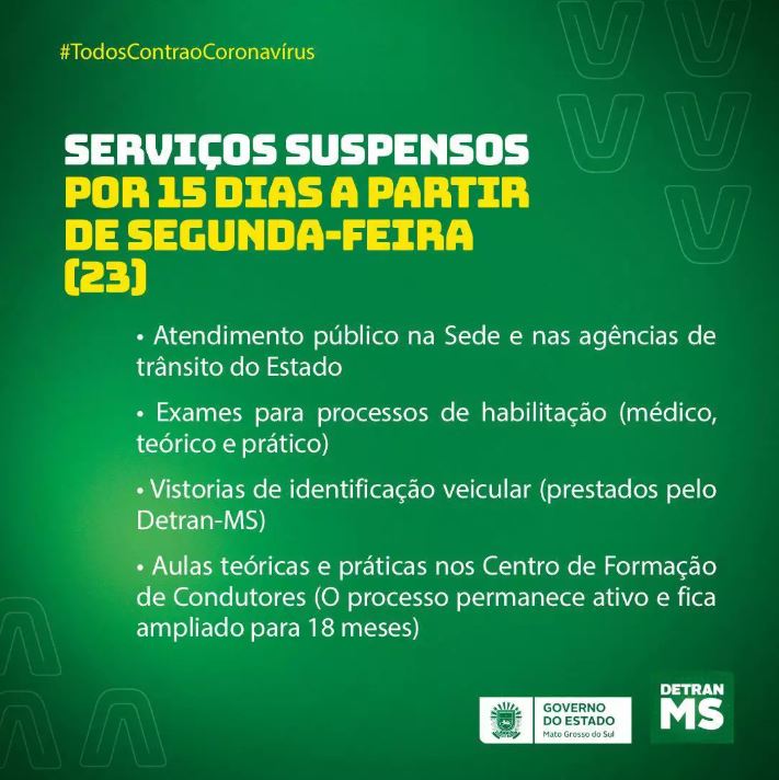 A partir desta segunda-feira (23), os atendimentos presenciais serão suspensos por 15 dias em todas as agências do Detran-MS (Departamento Estadual de Trânsito de Mato Grosso do Sul) para evitar aumento da propagação do coronavírus. Com isto, haverá prorrogação dos prazos de licenciamento de veículo e dos processos de formação de novos condutores.