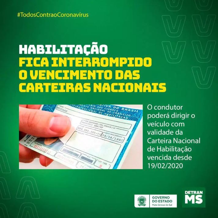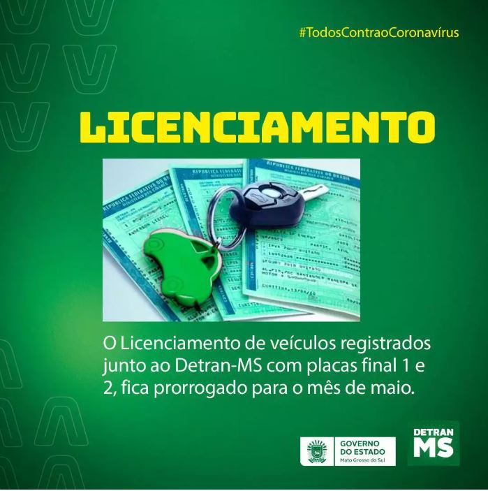 Em se tratando de licenciamentos, a prorrogação deve ocorrer até maio. Já o prazo de validade do processo de formação de novos condutores passará a ser de 18 meses. Portaria que trata sobre o assunto foi publicada no Diário Oficial de MS desta sexta-feira (20).