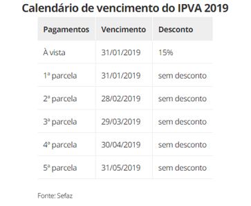 A guia para pagamento do IPVA 2019 já foi enviada pelos Correios aos que não receberam o benefício da isenção. E é preciso estar atento às datas para não perder o desconto à vista, ou para não ficar com o IPVA atrasado. Confira os vencimentos do IPVA 2019 divulgado pela Secretaria Estadual de Fazenda (Sefaz):