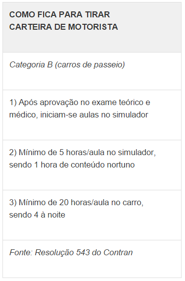 Os candidatos à obtenção da Carteira Nacional de Habilitação (CNH) de categoria B serão obrigados a fazer, no mínimo, 5 horas/aula, de simulação, sendo uma com conteúdo noturno, mas só após passarem nos exames médico e teórico. Após o treino com o simulador, eles iniciam as aulas práticas (veja na tabela).