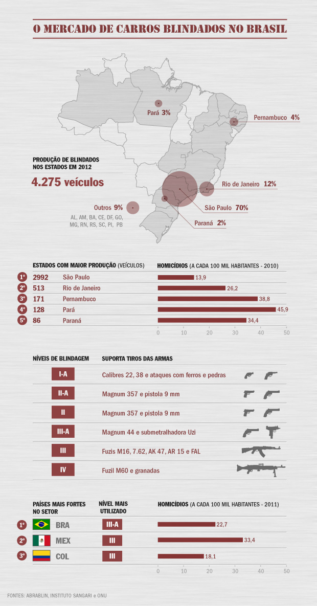 O Brasil é líder mundial no setor dos carros blindados, com 70 811 automóveis protegidos, segundo a Associação Brasileira de Blindagem (Abrablin). Só nos primeiros seis meses de 2012 foram modificados 4.275 veículos. A novidade é que o mercado, que se consolidou no Rio de Janeiro e em São Paulo durante a década de 1990, está se expandindo agora para outros estados que têm índices crescentes de criminalidade, como Pernambuco e Pará. Ao mesmo tempo, o serviço passa por um momento de popularização. Em busca das classes B e C, as empresas começaram a oferecer níveis de blindagem mais baratos.