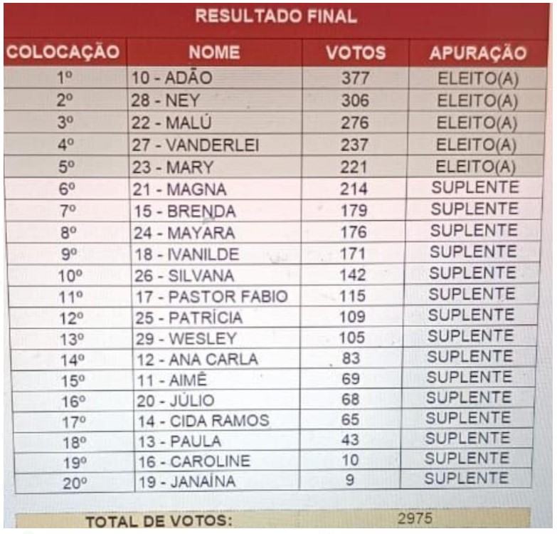 Além dos eleitos, também foram definidos os suplentes: Magna com 214 votos, Brenda Assistente Social com 179 votos, Mayara Kotay com 176 votos, Ivanilde Lima com 171 votos, Silvana Nascimento com 142 votos, Pastor Fábio Cota com 115 votos, Patrícia Calixtro com 109 votos, Wesley Ribeiro com 105 votos, Ana Carla com 83 votos, Aimê Araújo com 69 votos, Julio Viana com 68 votos, Cida Ramos com 65 votos, Paula Rocha com 43 votos, Caroline Santos com 10 votos e Janaína com 9 votos.