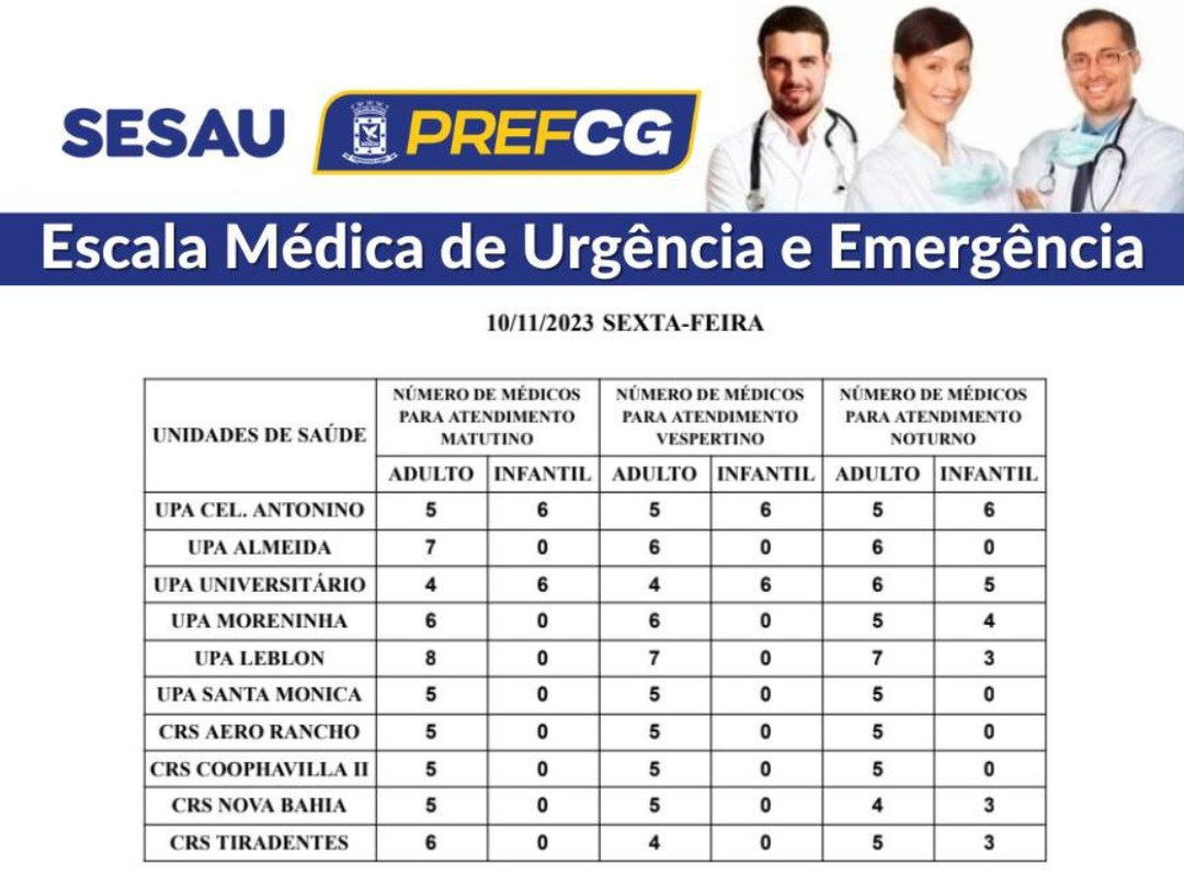 A escala médica de urgência e emergência da Sesau (Secretaria Municipal de Saúde) de Campo Grande, para esta sexta-feira (10), aponta 12 pediatras no período matutino e vespertino entre as UPAs (Unidades de Pronto Atendimento) Universitário e Coronel Antonino.