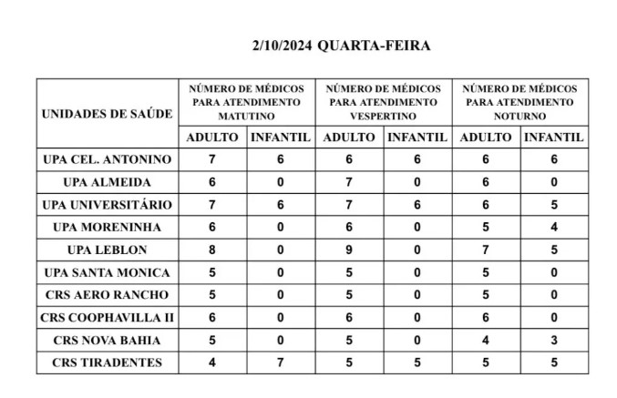 A Sesau (Secretaria Municipal de Saúde) divulgou a escala médica para as unidades de saúde de Campo Grande nesta quarta-feira (2), contando com mais de 60 profissionais entre UPAs (Unidades de Pronto Atendimento) e CRSs (Centros Regionais de Saúde).