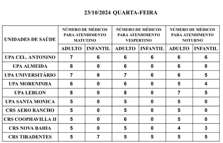 No período da manhã, 78 médicos estarão distribuídos pelas dez unidades de saúde 24h de Campo Grande. O atendimento pediátrico acontecerá exclusivamente nas UPAs Coronel Antonino, Universitário e CRS Tiradentes, garantindo assistência para crianças que necessitem de atendimento emergencial.