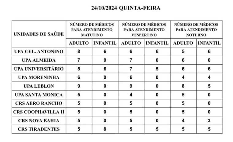 A Secretaria Municipal de Saúde (Sesau) de Campo Grande divulgou nesta quinta-feira (24) a escala plantonista de médicos das Unidades de Pronto Atendimento (UPAs) e Centros Regionais de Saúde (CRSs). Ao todo, mais de 60 profissionais estão disponíveis para atender a população ao longo do dia, com atendimento diferenciado para adultos e crianças.