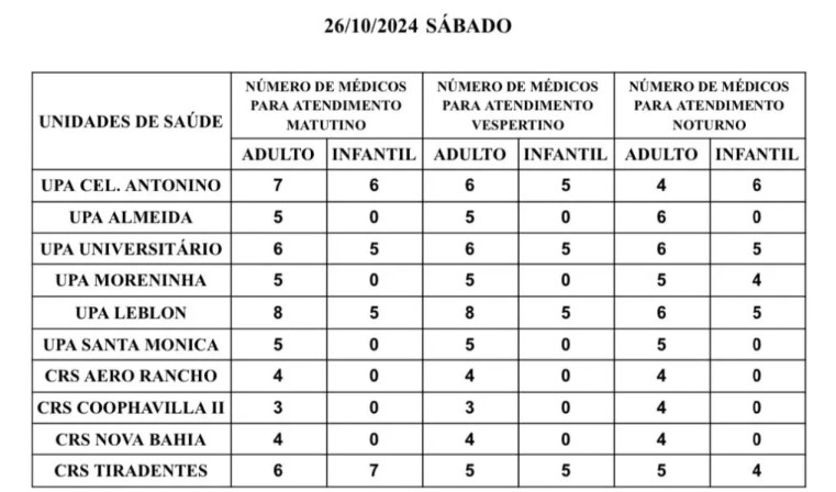 Para a noite, a Sesau programou um aumento no número de médicos, com 73 profissionais disponíveis nas unidades. O atendimento pediátrico também se expande durante este período, com suporte adicional na UPA Moreninha, além das unidades já mencionadas: