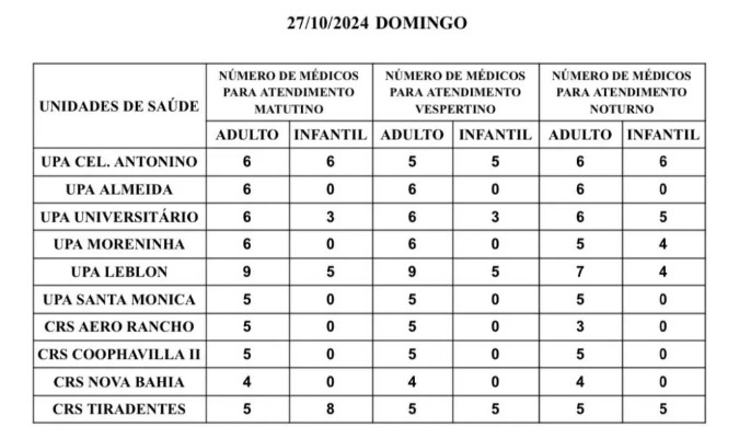 Pela manhã, as equipes contam com 57 clínicos gerais para adultos e 22 pediatras. Já no período da tarde, serão 56 clínicos para adultos e 18 para crianças. À noite, a escala é composta por 52 médicos para atendimento adulto e 24 pediatras, mantendo o suporte à população até o fim do dia de votação.
