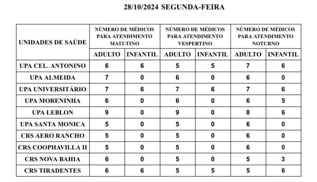 Nesta segunda-feira (28), as Unidades de Pronto Atendimento (UPAs) e os Centros Regionais de Saúde (CRSs) de Campo Grande contam com mais de 60 médicos escalados por período para atendimento à população. A informação foi divulgada pela Secretaria Municipal de Saúde (Sesau), que organizou o cronograma para garantir o suporte adequado aos pacientes.