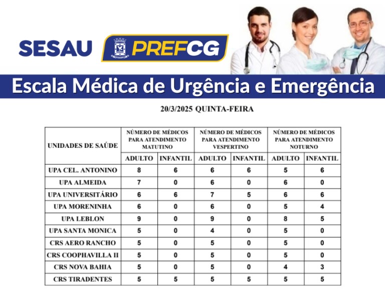 A Secretaria Municipal de Saúde (Sesau) divulgou a escala médica de urgência e emergência para esta quinta-feira (20) nas UPAs (Unidades de Pronto Atendimento) e CRSs (Centros Regionais de Saúde) de Campo Grande. Mais de 100 médicos clínicos, incluindo pediatras, estarão em atendimento ao longo do dia.
