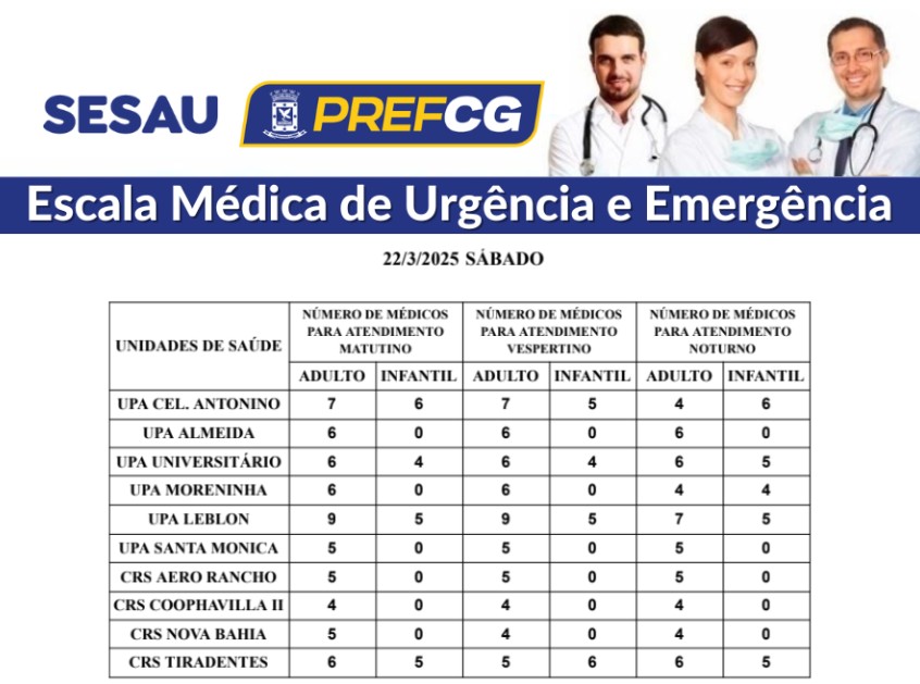 A Secretaria Municipal de Saúde (Sesau) divulgou a escala médica deste sábado (22), garantindo atendimento com mais de 60 profissionais de saúde nas Unidades de Pronto Atendimento (UPAs) e nos Centros Regionais de Saúde (CRSs) de Campo Grande. O serviço abrange atendimentos pediátricos e adultos em três turnos.