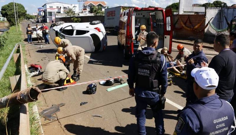 Três pessoas se envolveram em acidente na tarde deste sábado (18) no cruzamento da Avenida Norte Sul com a Fernando Corrêa da Costa, em Campo Grande. Motorista do carro de passeio atropelou piloto e ocupante de moto, tombou e, por pouco, não caiu no Rio Anhanduí.