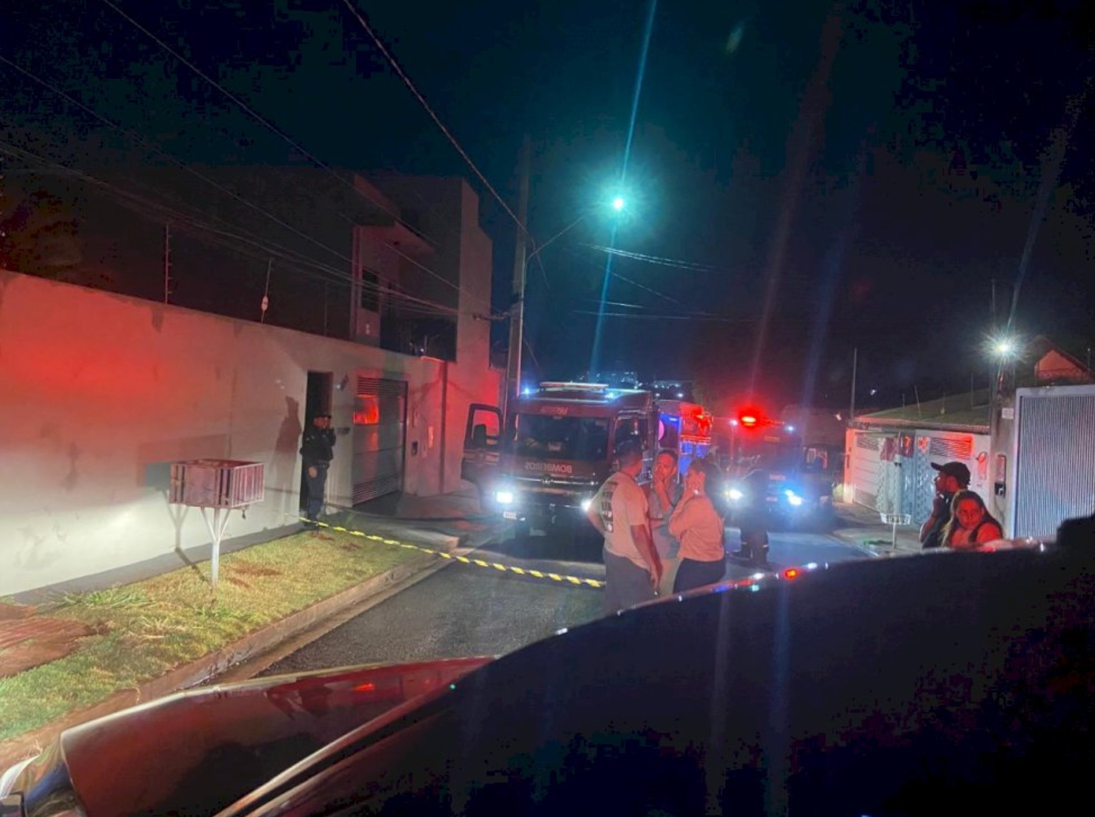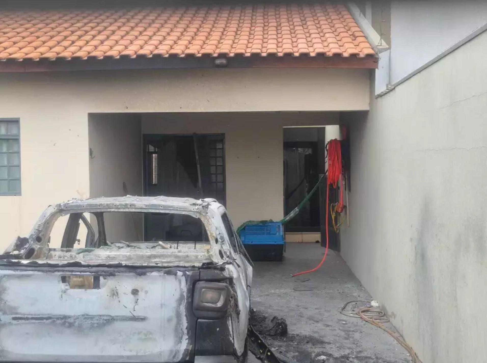 No local, policiais encontraram uma faca com sangue, marcas que indicam arrasto, além de galões de álcool e thinner usados para espalhar as chamas. O fogo destruiu parte da residência, atingindo o telhado, e só foi controlado após a atuação de 11 militares do Corpo de Bombeiros, que utilizaram quatro viaturas e 3 mil litros de água.