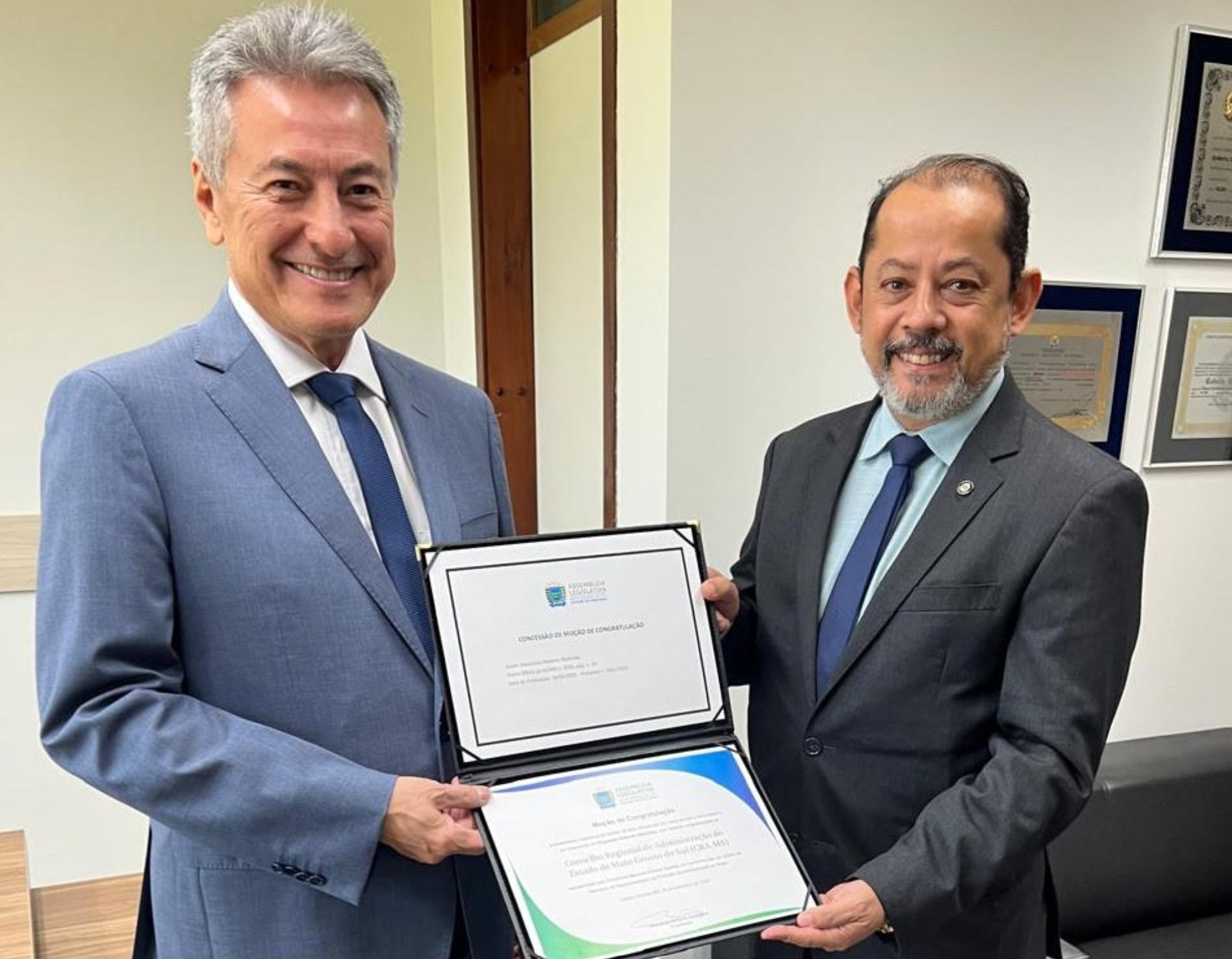 Na manhã desta quinta-feira (2), o deputado estadual Roberto Hashioka (União Brasil) entregou uma moção de congratulação a Marcelo Gomes Soares, presidente do Conselho Regional de Administração de Mato Grosso do Sul (CRA-MS), em alusão ao Jubileu de Diamante da regulamentação da profissão de administrador no Brasil.