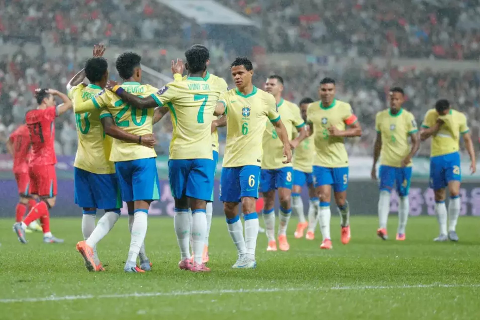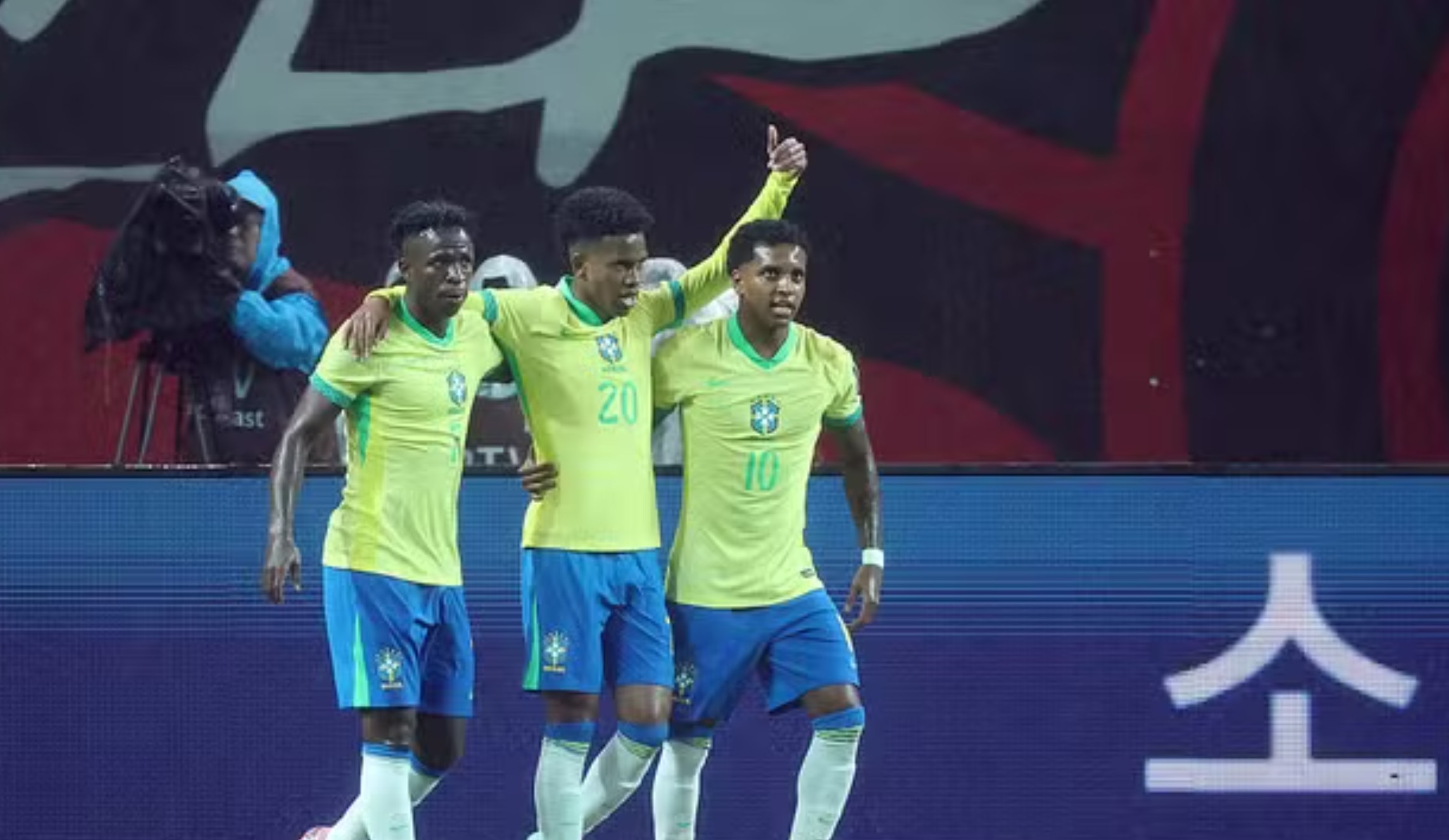 A Seleção Brasileira deu um show em Seul nesta sexta-feira (10), ao aplicar uma goleada de 5 a 0 sobre a Coreia do Sul, no Estádio Copa do Mundo. Em sua melhor atuação desde que Carlo Ancelotti assumiu o comando, o time mostrou entrosamento, intensidade e poder ofensivo, com destaque para Estêvão e Rodrygo, que marcaram dois gols cada, e Vinícius Júnior, autor do quinto.