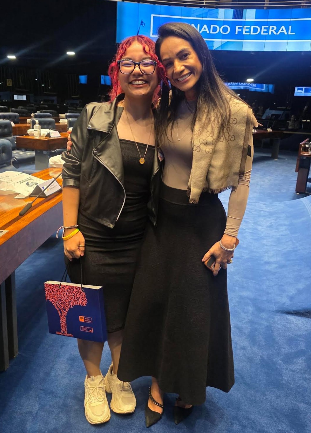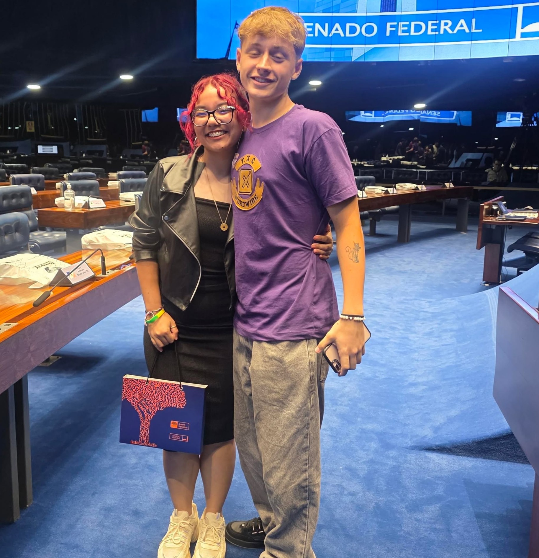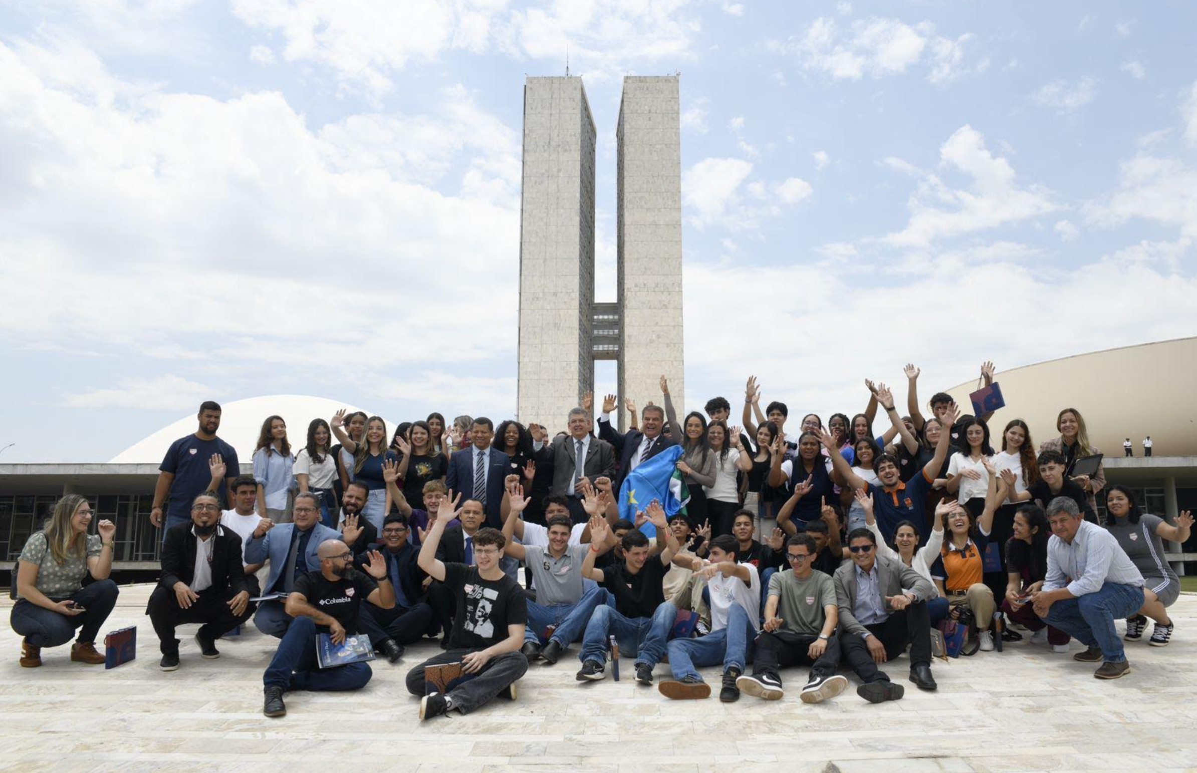 Durante a visita ao Senado Federal, em Brasília, os jovens participaram de uma programação especial que incluiu uma roda de conversa com o senador e um tour guiado pelo Congresso Nacional, com explicações sobre o funcionamento do Poder Legislativo e o simbolismo da arquitetura de Oscar Niemeyer.