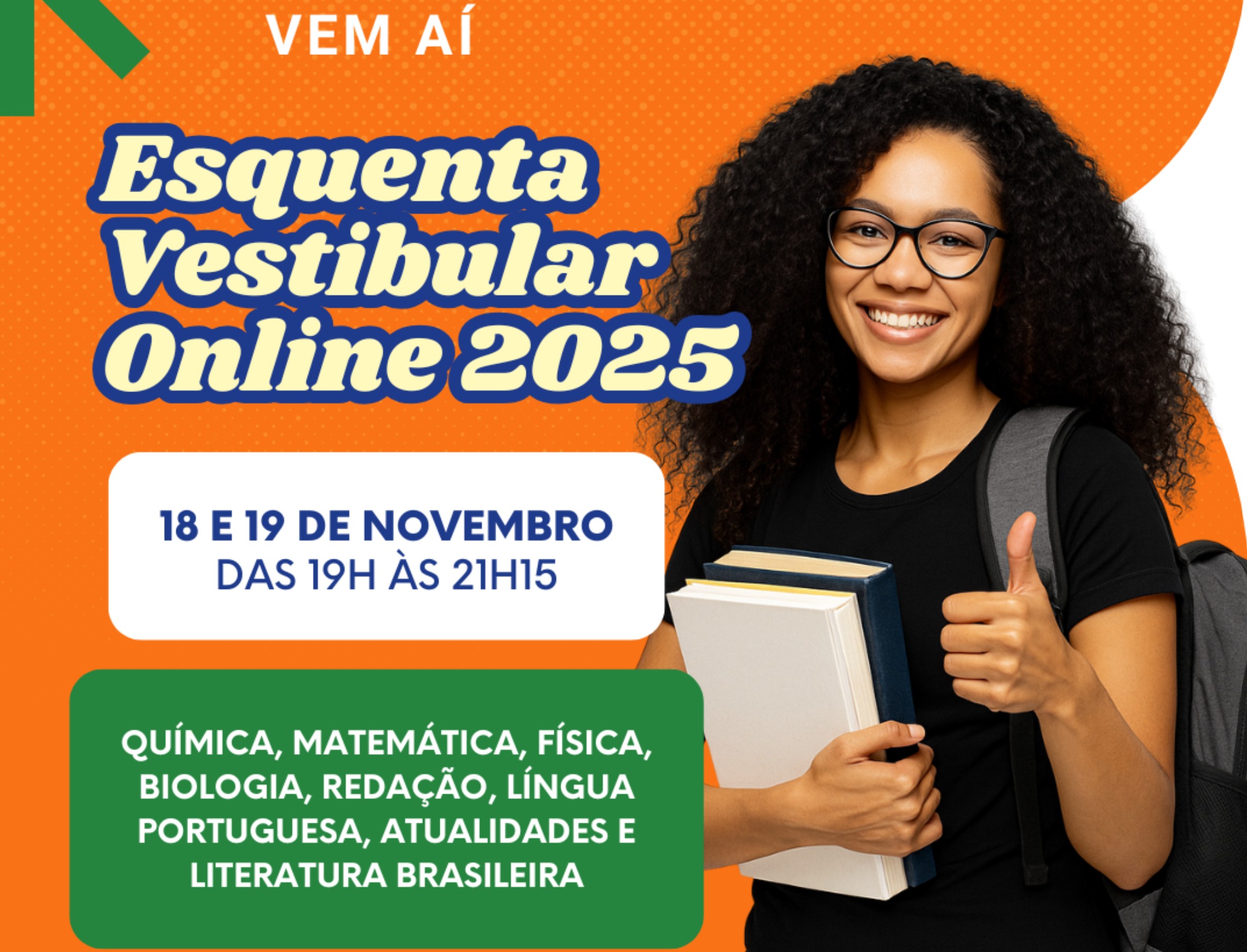 Na reta final para o Vestibular UEMS 2026, a Universidade Estadual de Mato Grosso do Sul lança o Esquenta Vestibular Online 2025, uma série de aulões gratuitos, ao vivo e abertos a todos os candidatos. As aulas serão realizadas nos dias 18 e 19 de novembro, das 19h às 21h15, pela plataforma Google Meet.