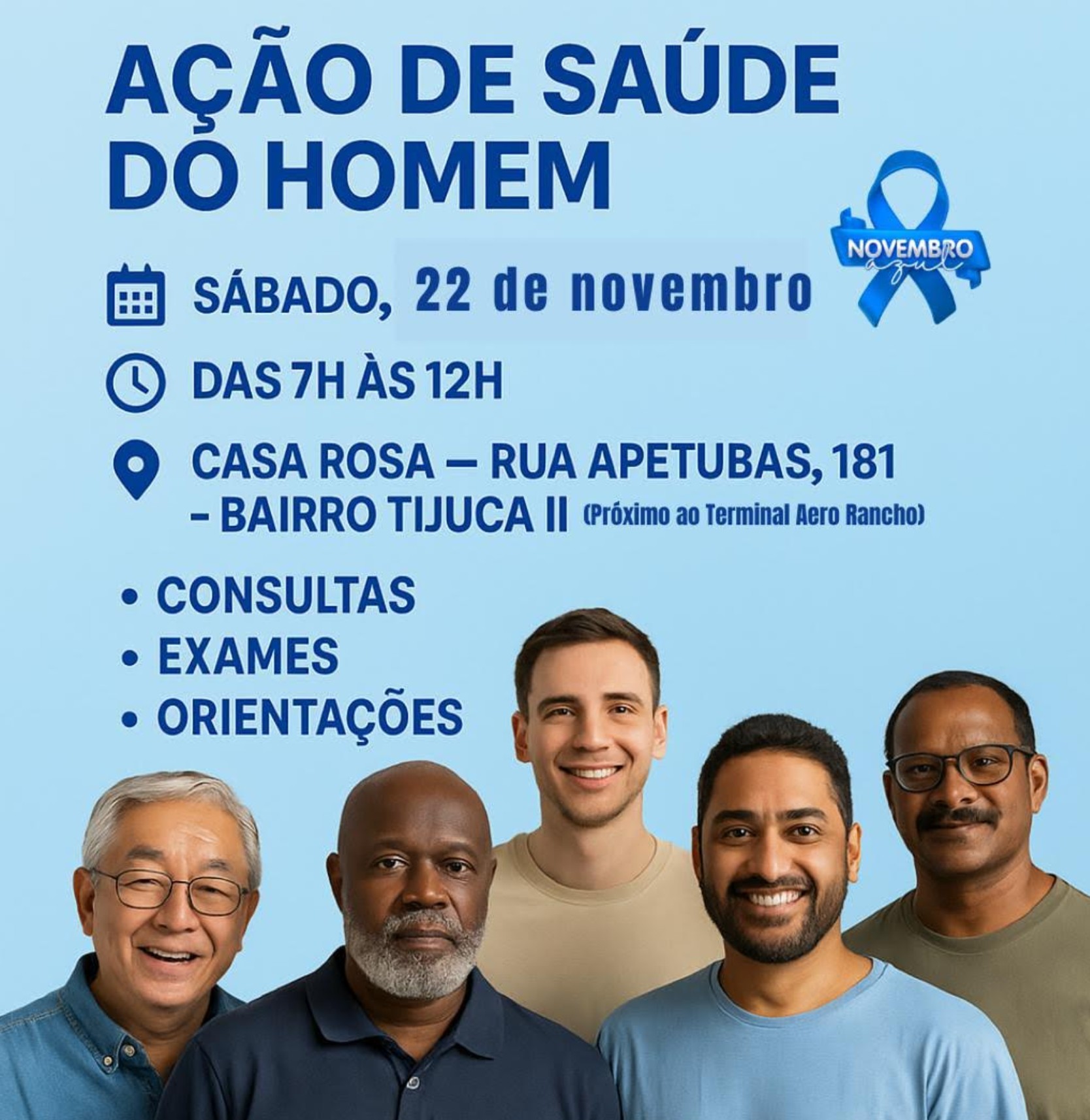 A Casa Rosa promove, neste sábado (22), uma Ação de Saúde do Homem, em alusão ao Novembro Azul, com uma manhã inteira dedicada a cuidados, prevenção e orientação gratuita à população. O atendimento será realizado das 7h às 12h, na sede da instituição, localizada na Rua Apetubas, 181, Bairro Tijuca II, próximo ao Terminal Aero Rancho.