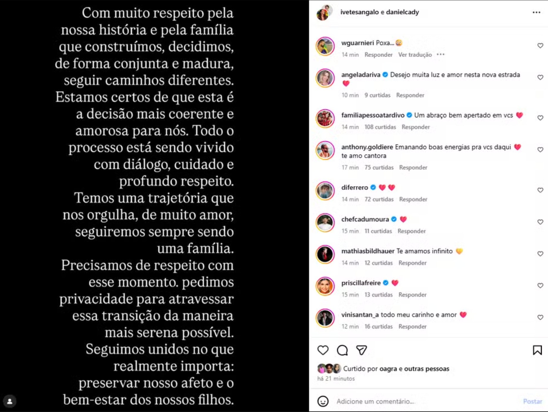 Dois meses antes de anunciar o fim do casamento de 14 anos com o nutricionista Daniel Cady, a cantora Ivete Sangalo chamou atenção ao interagir em uma publicação sobre relacionamentos. Em setembro, a artista comentou um vídeo do influenciador Lipe, que abordava a importância do afeto cotidiano, das demonstrações de amor e da frequência sexual entre casais.