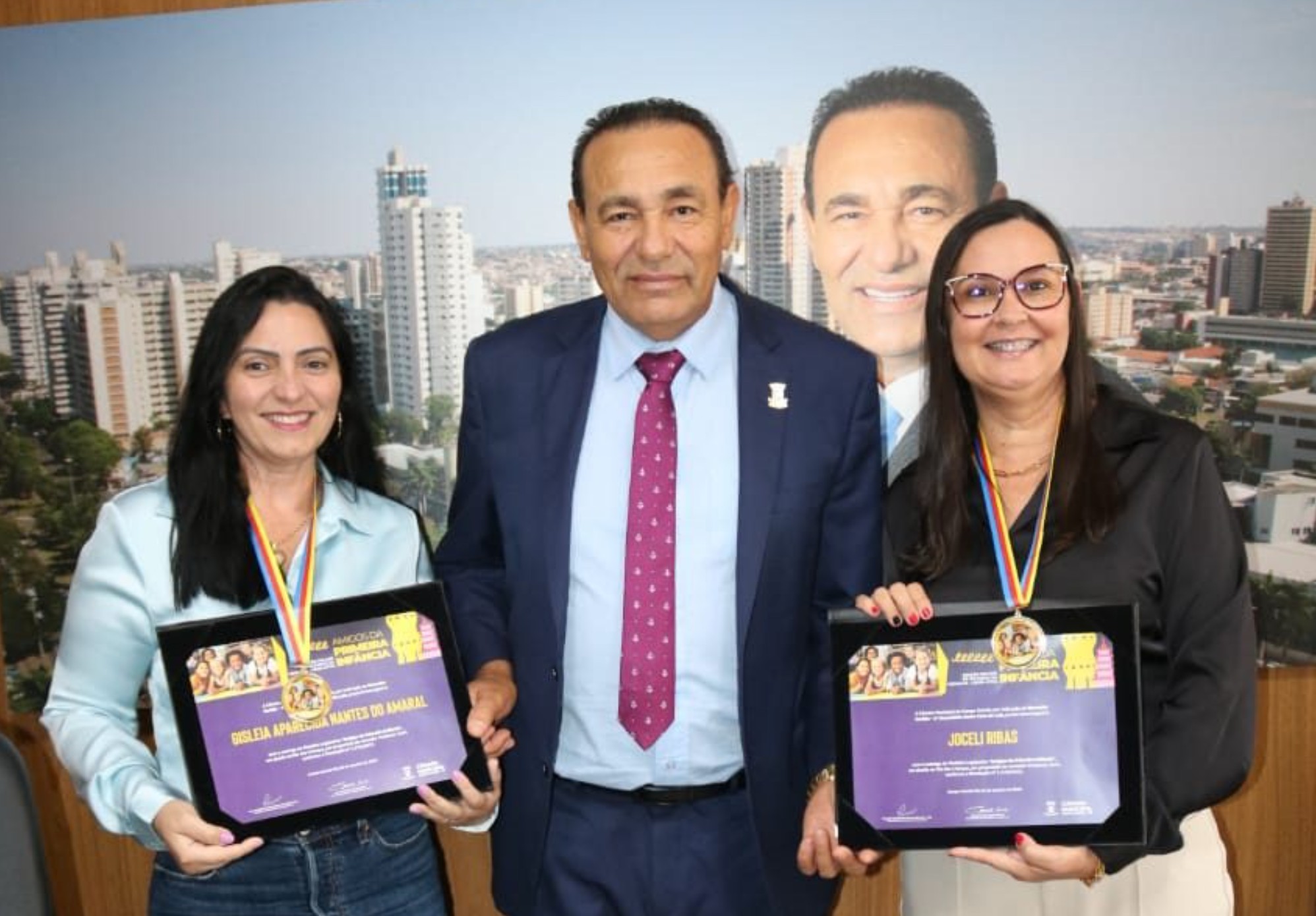O vereador Carlos Augusto Borges, o Carlão (PSB), 1º secretário da Mesa Diretora da Câmara Municipal de Campo Grande, entregou na manhã desta terça-feira (14), em seu gabinete, a Medalha “Amigos da Primeira Infância” às pedagogas Joceli Ribas e Gisleia Aparecida Nantes do Amaral, destacando o compromisso de ambas com o desenvolvimento integral das crianças na rede municipal de ensino.
