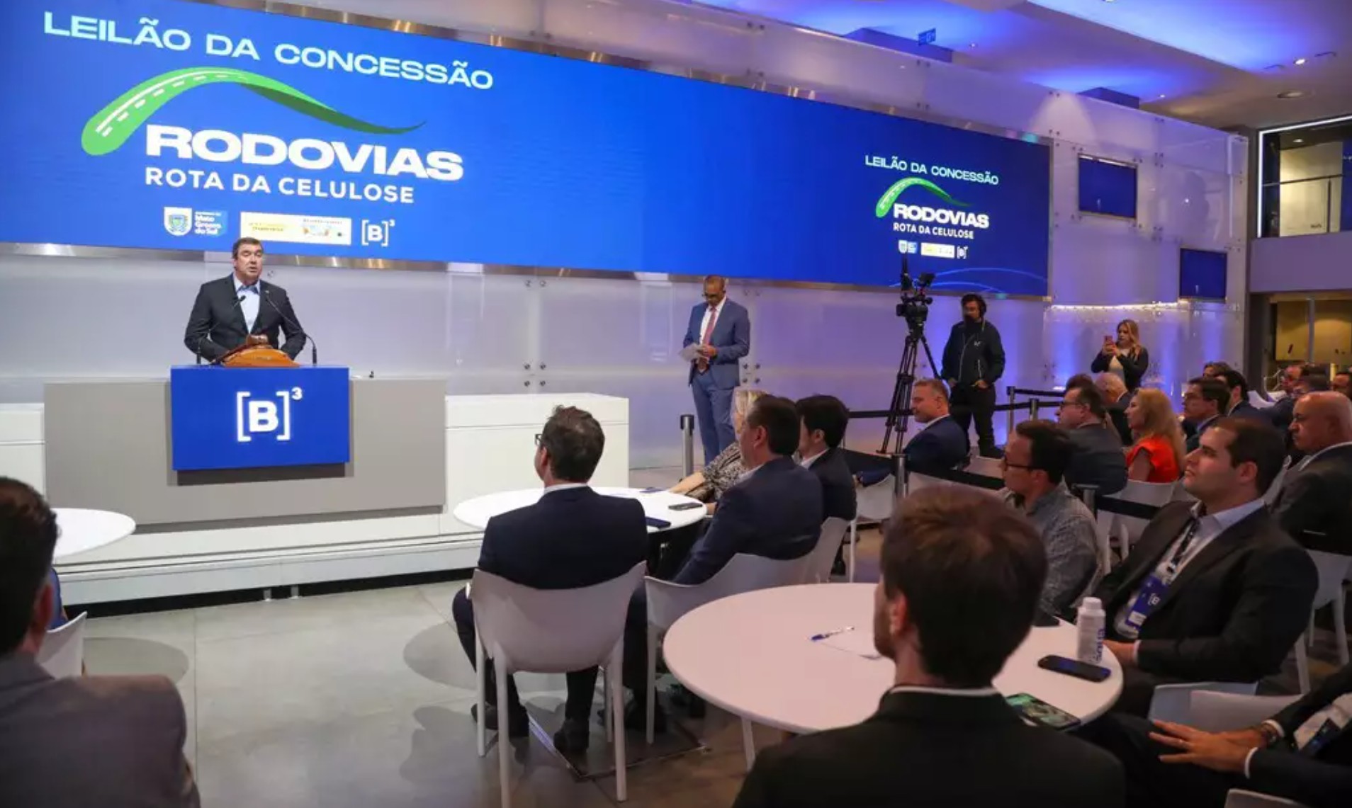 Governador Eduardo Riedel (PP) na B3 durante o leilão da Rota da Celulose, em maio deste ano