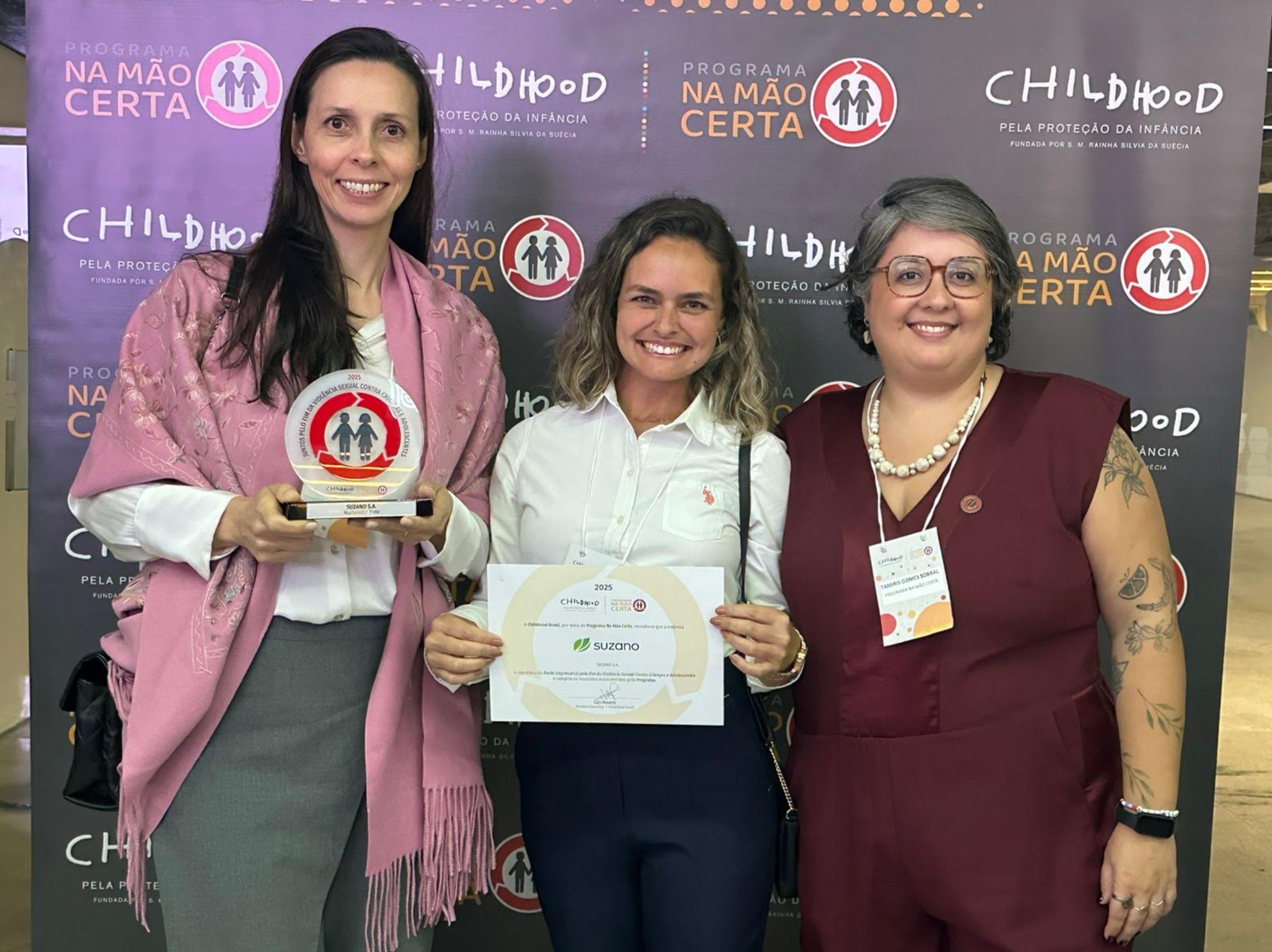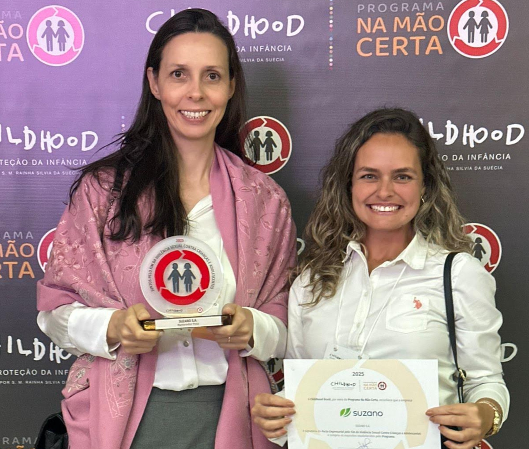 Durante o evento, a Suzano recebeu troféu e certificado, que simbolizam a parceria contínua com o Programa Na Mão Certa e com a Childhood Brasil.