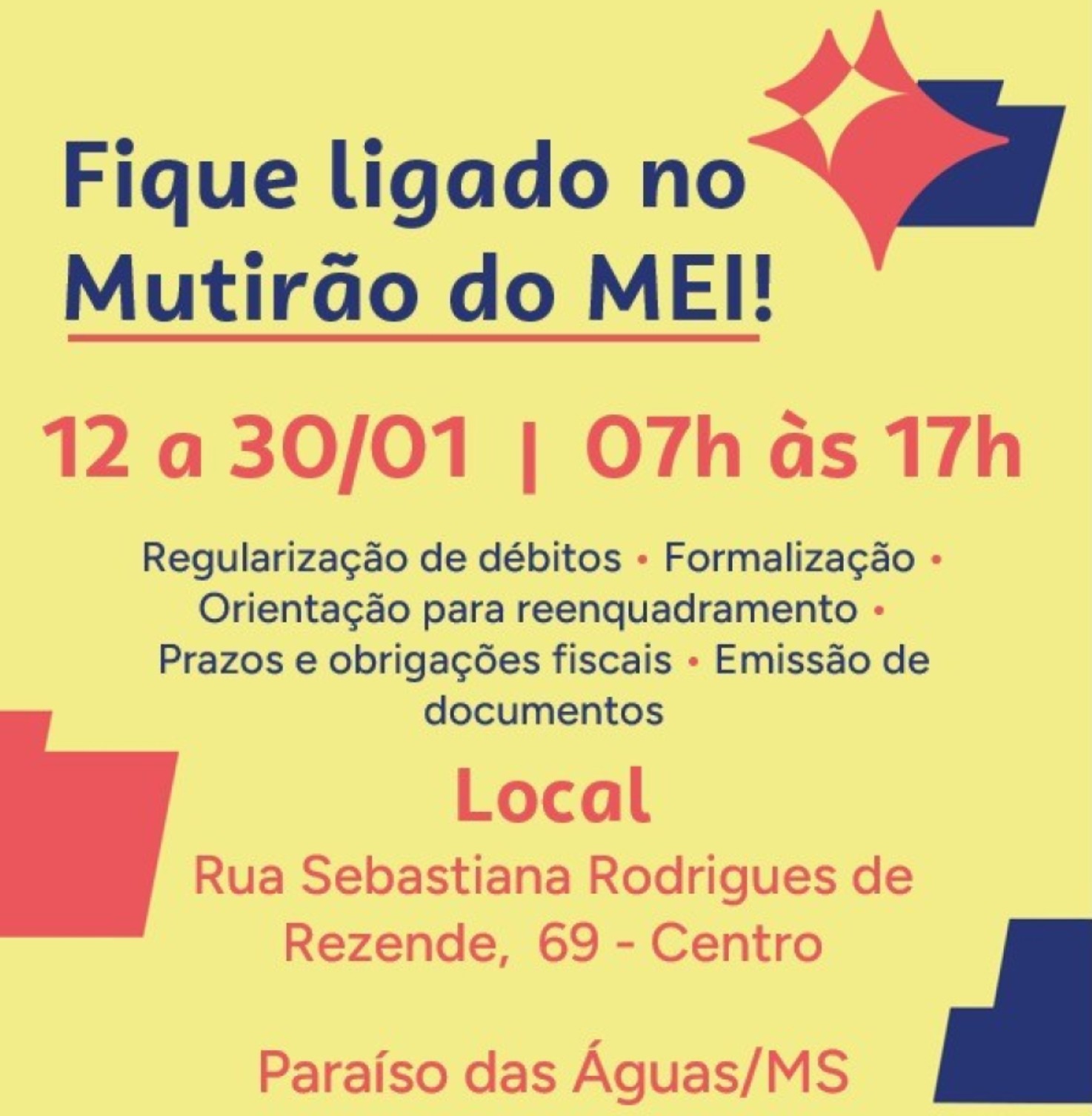 Os microempreendedores individuais (MEIs) de Paraíso das Águas têm até 30 de janeiro para aproveitar os atendimentos do Mutirão do MEI, que ocorre das 7h às 17h, com serviços gratuitos voltados à orientação, regularização e fortalecimento dos pequenos negócios no município.