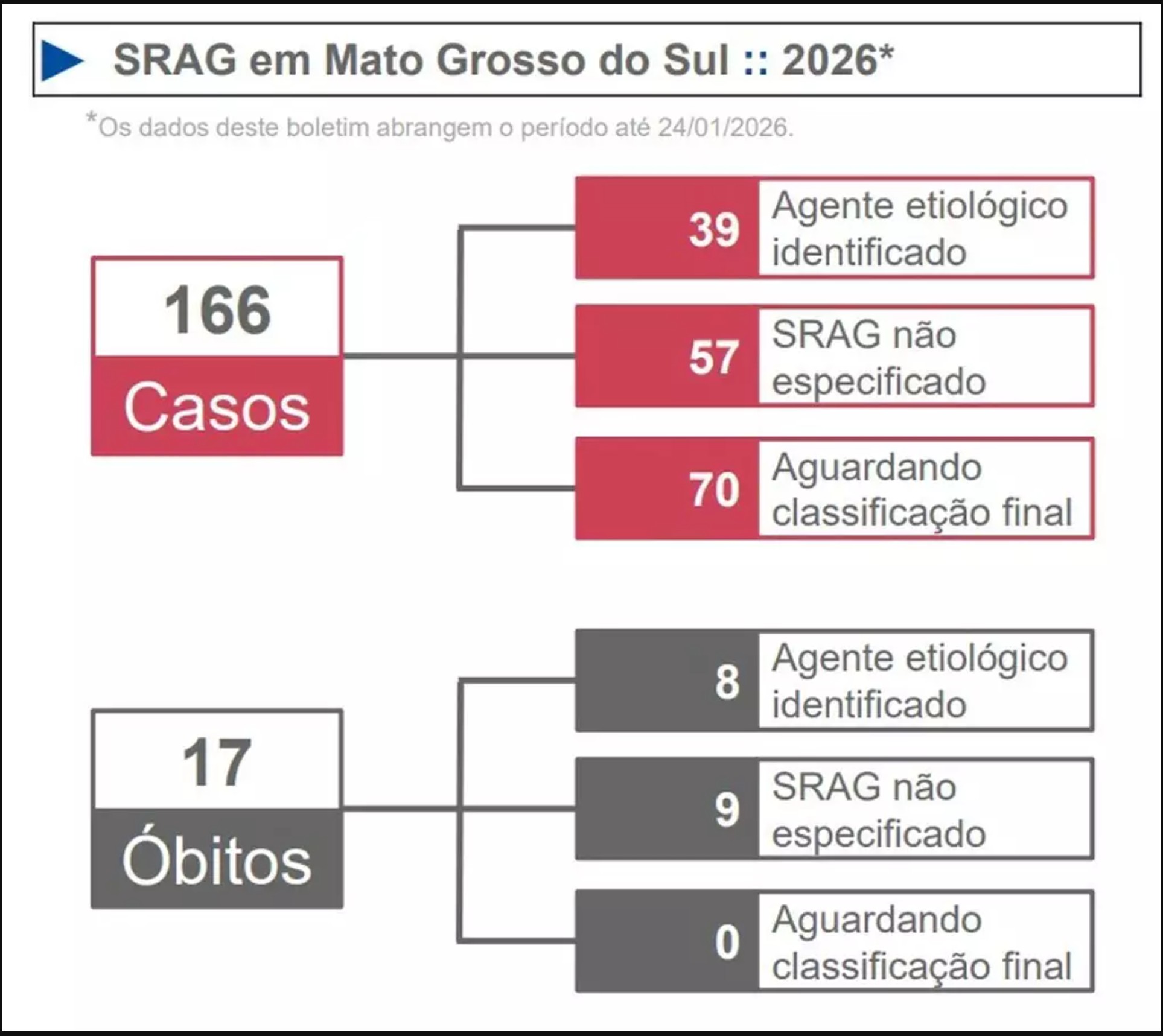 Mato Grosso do Sul já contabiliza 17 mortes por Síndrome Respiratória Aguda Grave (SRAG) nas primeiras semanas de 2026. Os dados constam no boletim epidemiológico mais recente da Secretaria de Estado de Saúde de Mato Grosso do Sul (SES), com informações consolidadas até 24 de janeiro.
