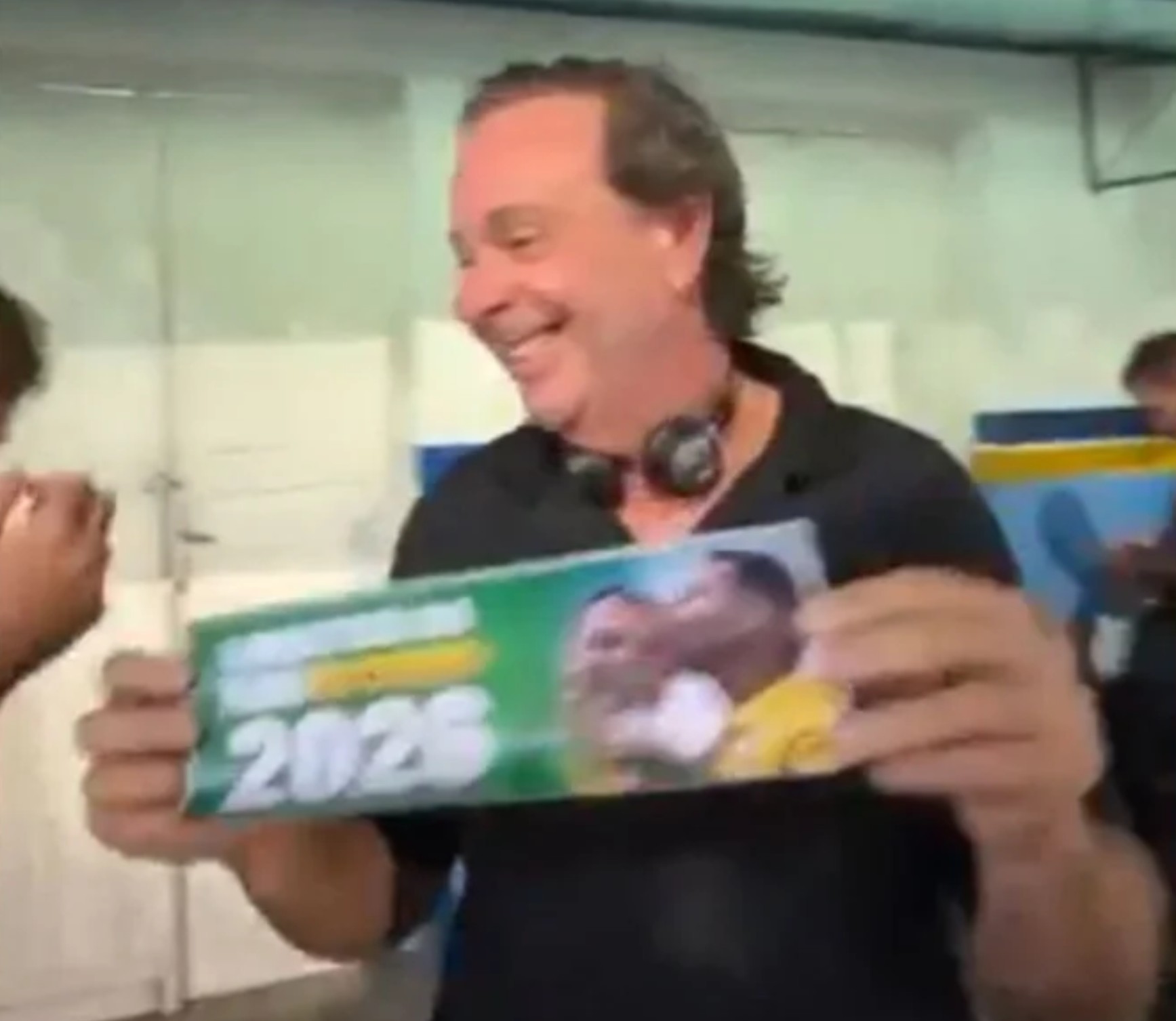 O material exibido traz a imagem de Flávio Bolsonaro ao lado do ex-presidente Jair Bolsonaro (PL), acompanhado da frase: “O Brasil está com Flavio Bolsonaro 2026”, em referência à disputa presidencial prevista para 2026.
