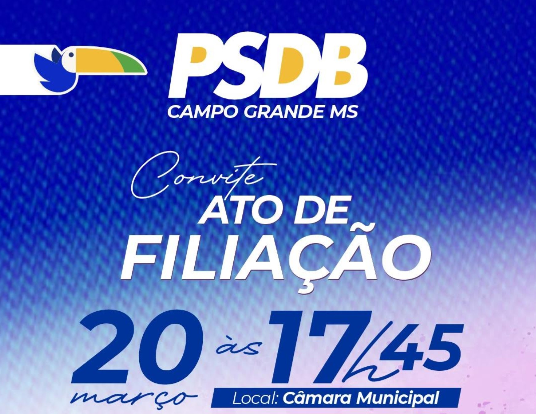 O PSDB de Campo Grande realizará no próximo 20 de março, às 17h45, um ato de filiação partidária no plenário da Câmara Municipal de Campo Grande, localizada na Avenida Ricardo Brandão, nº 1.600, no bairro Jatiuca Park. A iniciativa busca ampliar a base de filiados e fortalecer a estrutura do partido na capital sul-mato-grossense com foco nas eleições de 2026.
