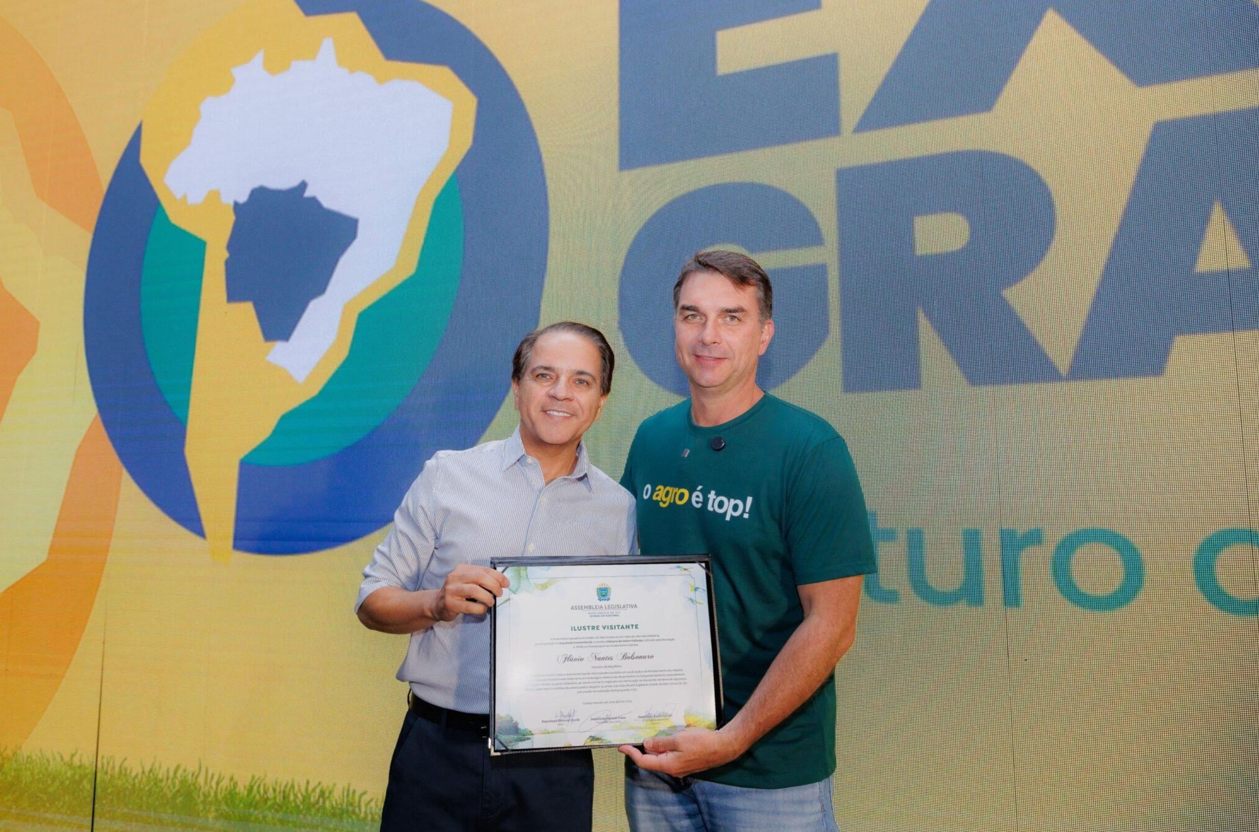 A homenagem, proposta por Coronel David, foi concedida pela Assembleia Legislativa de Mato Grosso do Sul como forma de reconhecimento à atuação de Flávio Bolsonaro no cenário nacional e à presença do parlamentar em agendas no Estado.