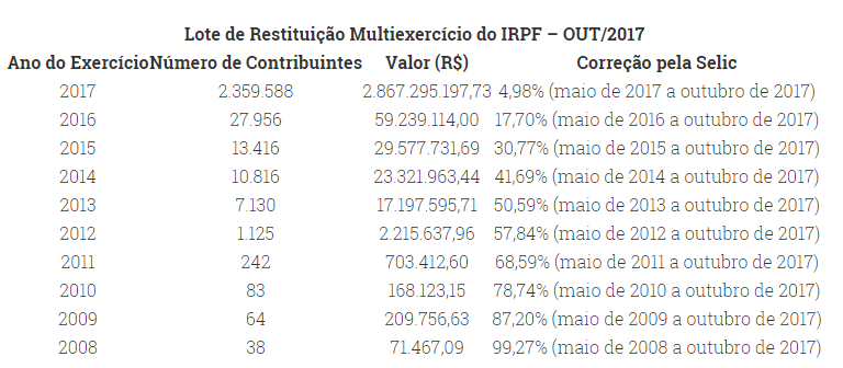 O lote multiexercício de restituição do Imposto sobre a Renda da Pessoa Física contempla também restituições residuais dos exercícios de 2008 a 2016