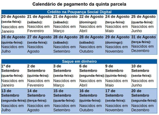 O calendário é organizado em ciclos de crédito em conta e de saque em espécie, de acordo com o mês de nascimento. O saque pode ser feito nas agências da Caixa, lotéricas ou nos correspondentes Caixa Aqui.