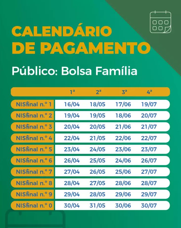 Para os beneficiários do Bolsa Família, o pagamento ocorre de forma distinta. Os inscritos podem sacar diretamente o dinheiro nos dez últimos dias úteis de cada mês, com base no dígito final do NIS.