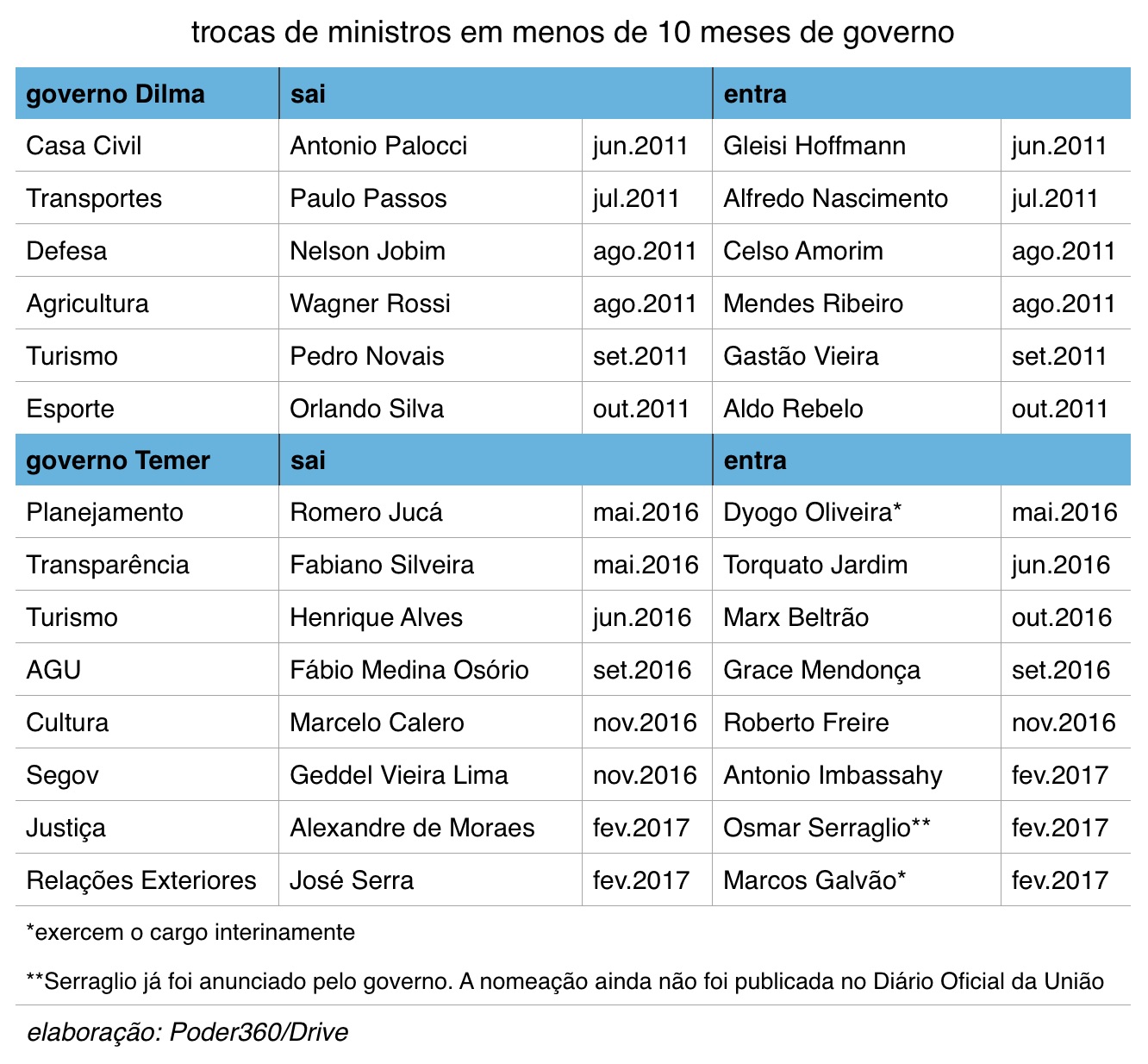 De acordo com dados do site Poder360, Dilma mudou 6 ministro no período, enquanto Temer fez 8 alterações em menos de 10 meses. A gestão do peemebedista tem, ainda, dois ministros interinos atualmente: Dyogo Oliveira (Planejamento) e Marcos Galvão (Relações Exteriores).