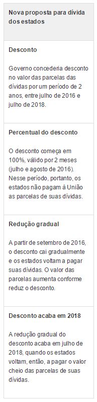 Outra mudança é na redução gradual do percentual desse desconto. Pela nova proposta, informou Perillo, ele começa em 100% e vai vigorar entre julho e agosto de 2016. Nesse período, portanto, os estados deixam de pagar totalmente as parcelas das dívidas.