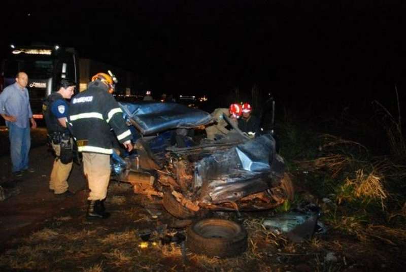 | Carro ficou completamente destruído depois de colidir em carreta. (Foto: Tiago Apolinário/ Da Hora Bataguassu) |