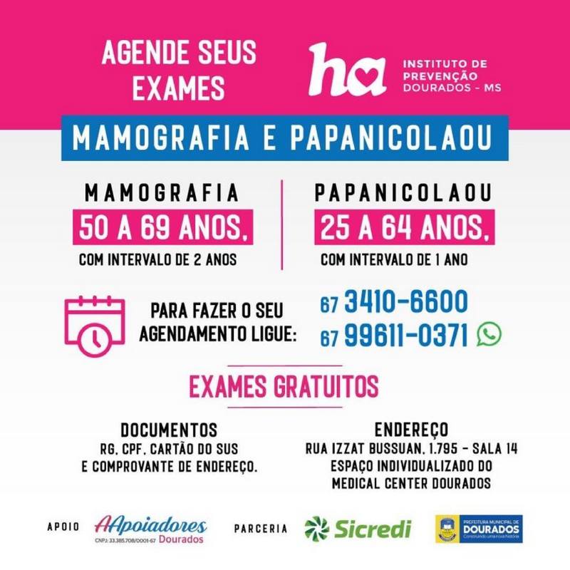 O exame da mamografia é direcionado para mulheres entre 50 a 69 anos e deve ser realizado com um intervalo de 2 anos. Já o papanicolau é realizado para mulheres entre 25 a 64 anos e a indicação é com intervalo de 1 ano. Os resultados dos exames realizados também são retirados no local e quando necessário pode-se encaminhar a paciente para realizar exames complementares.